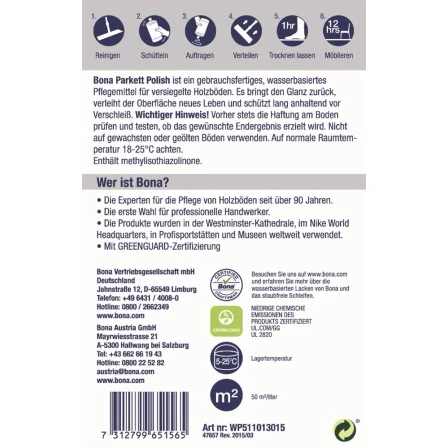 Bona Parkett Polish ist ein gebrauchsfertiges Wachs-Pflegemittel auf Wachsbasis für lackierte Holzböden. Die Politur frischt die Oberfläche wieder auf und schützt lang anhaltend vor Verschleiß. Eine Schicht Polish wirkt wie ein Reparaturset für lackierte Holzböden und füllt Mikrokratzer im Belag des Bodens auf und sorgt für ein gleichmäßiges Erscheinungsbild. Eine 1-Liter-Flasche reicht für ca. 50 m² Boden und sorgt für ein gleichmäßiges Ergebnis und einen frischen Glanz. Die Greenguard-Gold-Zertifizierung gewährleisten ein sicheres Produkt für Familie, Haustiere und Umwelt. Bona – seit 1919 von Profis empfohlen.