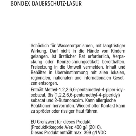Für lasierende, wetterbeständige Anstriche auf allen Laub- und Nadelhölzern im Außenbereich, auch tropische Holzarten. Besonders geeignet für maßhaltige Holzbauteile (Fenster & Außentüren) und begrenzt maßhaltige Holzbauteile. Für großflächige Anstriche im Innenbereich Bondex Lasuren für innen einsetzen. Nicht für horizontale Flächen wie z. B. Terrassen und Balkonböden, Gartenparkett etc. geeignet. Vor Gebrauch eventuell nur leicht aufrühren. Verarbeitung und Trocknung nicht bei Temperaturen unter + 5 Grad Celsius und/oder relativer Luftfeuchtigkeit > 80%. Um Farbtongleichheit zu gewährleisten, nur Material mit gleicher Chargen-Nr. an einer Fläche verarbeiten.