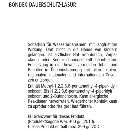 Für lasierende, wetterbeständige Anstriche auf allen Laub- und Nadelhölzern im Außenbereich, auch tropische Holzarten. Besonders geeignet für maßhaltige Holzbauteile (Fenster & Außentüren) und begrenzt maßhaltige Holzbauteile. Für großflächige Anstriche im Innenbereich Bondex Lasuren für innen einsetzen. Nicht für horizontale Flächen wie z. B. Terrassen und Balkonböden, Gartenparkett etc. geeignet. Vor Gebrauch eventuell nur leicht aufrühren. Verarbeitung und Trocknung nicht bei Temperaturen unter + 5 Grad Celsius und/oder relativer Luftfeuchtigkeit > 80%. Um Farbtongleichheit zu gewährleisten, nur Material mit gleicher Chargen-Nr. an einer Fläche verarbeiten.