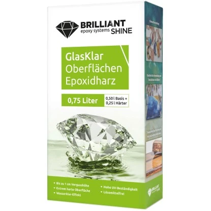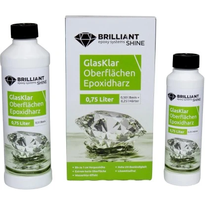 Das Brilliant Shine Gießharz Oberflächen A+B 0,75 l ist ein hochwertiges 2-Komponenten Design Epoxid Gießharz zur Erstellung individueller Design Objekte. Die besondere Harzqualität sorgt für absolut wasserklare Transparenzen, hochbrilliante Farben und außergewöhnliche Tiefeneffekte.