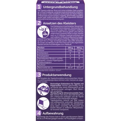 Anwendung: Vor dem Auftragen muss sichergestellt werden, dass die Untergründe trocken, tragfähig, gleichmäßig saugfähig, sauber, glatt und für die vorgesehene Wandbekleidung hinreichend ebenflächig sind. Das Pulver unter kräftigem Rühren in einen Eimer mit kaltem Wasser geben und 1 Minute intensiv weiterrühren. Nach 2 – 3 Minuten Quellzeit aufrühren und nach weiteren 15 Minuten nochmals kräftig durchschlagen. Metylan Vinyl & Spezial ist nun gebrauchsfertig. Es wird empfohlen, den Tapetenkleister bei einer Temperatur von 18 °C aufzutragen.
