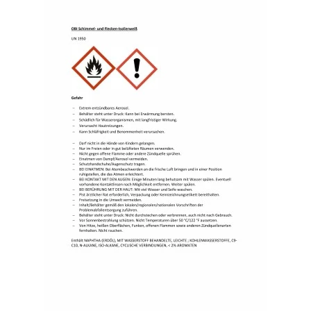 Isoliert durch einfaches Aufsprühen zuverlässig und dauerhaft Wasserränder, Verfärbungen durch Schimmel und Stockflecken und ähnliche wasserlösliche Verunreinigungen des Untergrundes. Nach dem Durchtrocknen bildet OBI Schimmel- und Flecken-Isolierweiß eine nicht wasserlösliche Sperrschicht und wirkt so ohne Zusatz biozider Wirkstoff einem Neubefall mit Schimmel entgegen. Bereits nach einer Trockenzeit von ca. 10 min können die isolierten Flächen in gewohnter Weise tapeziert oder mit allen handelsüblichen Lacken-, Öl- und Dispersionsfarben überstrichen werden.