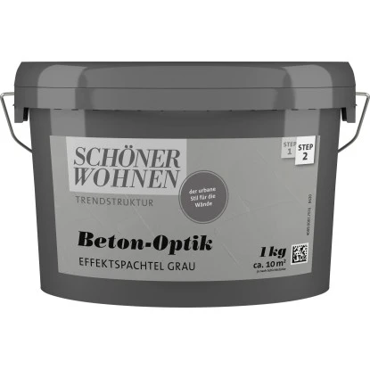 Die Schöner Wohnen Trendstruktur ist eine lösemittelfreie Spachtelmasse, für die Grundspachtelung im Systemaufbau mit Beton-Optik Effektspachtel. Sie schafft einzigartige Oberflächen mit betonartigem Effekt in nur zwei Arbeitsgängen. Geeignete Untergründe sind Putz, Gipskarton- und Zementfaserplatten sowie glatte Vliestapeten.