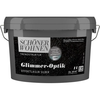 Die Schöner Wohnen Glimmer-Optik ist eine lösemittelfreie, transparente, leicht zu verarbeitende, wasserdampfdurchlässige und scheuerbeständige Lasur mit metallischen Effektpigmenten. Zur Veredelung der Trendstrukturen Wisch-Optik, Strukturfarbe oder als Finish auf einem Trendfarben-Anstrich. Optimal geeignet auf Rauhfaser und Prägetapeten, alten Dispersionsfarbenanstrichen sowie Putz, Gipskarton- und Zementfaserplatten.