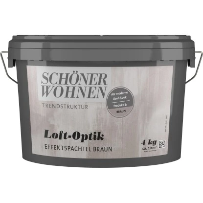 Kreieren Sie sich Ihr eignes Loftfeeling mit der Schöner Wohnen Trendstruktur Loft-Optik. Durch den Effekt von verwaschenem Used-Look erhalten Ihre Wände einen industrillen Touch und werden zum Hingucker in jedem Raum. Dazu passen vor allem Möbel und Dekorationen im minimalistischen und industriellen Stil. Sie können mit dieser Trendstruktur aber auch Stile vermengen und zum Beispiel romantisch, verspielte Accessoires oder knallige Farben dazu kombinieren.