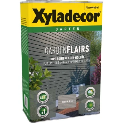 Das Holz-Öl GardenFlairs von Xyladecor ist imprägnierend und verleiht dem Holz eine natürliche klassikgraue Optik. Es ist nicht nur holzpflegend, sondern simuliert durch die spezielle Aluminium-Pigmentierung einen dekorativen Metalleffekt. Dadurch entsteht eine natürlich gealterte und gleichmäßige Holzoptik. Das Holz-Öl erzeugt eine edle, seidenmatte, nicht abplatzende und pflegeleichte Oberfläche. Es ist ideal für zum Beispiel Holzterrassen, Pergolen, Sichtblenden, Zäunen, Verbretterungen und Carports geeignet.